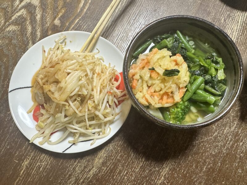 冷凍焼き鳥、冷凍かき揚げ、冷凍ほうれん草、冷凍インゲン、冷凍ブロッコリー、冷凍きしめん、冷凍オニオンスライスそれに冷凍ネギ。生なのはもやしだけ。ドリンクも”おうちでドリンクバー”という、濃縮型のジュースだ。きしめんは、冷凍物の入れ過ぎで、冷たかった。失敗作だ。”GoogleGemini先生”に事の顛末を入力すると、「器ごとレンジに入れて温め直しましょう!」っと。なるほど・・・、でもかき揚げは、しっかり染み込んでフヤフヤになっていた。明日からは、具材だけ最初にレンチンしなきゃ!