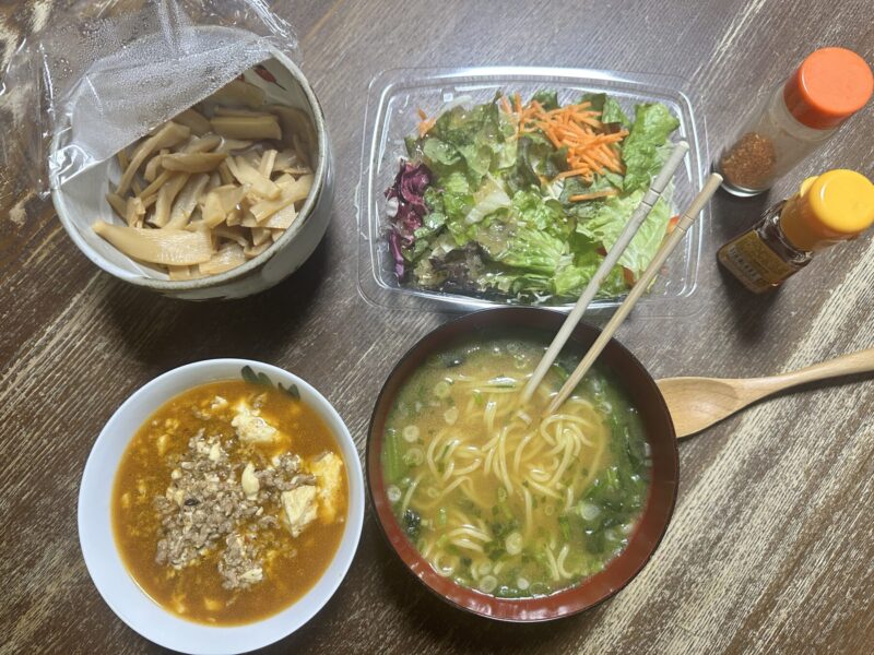今日は、冷凍しておいた挽肉を使っての麻婆豆腐と半ラーメンにサラダ。中華食だ。塩分だけは注意しないと・・・
