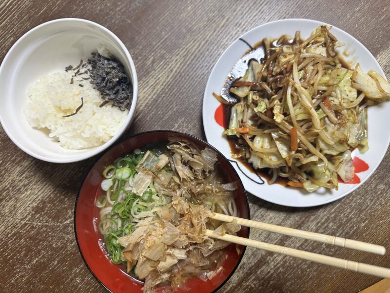 ちょっと、消費期限1日過ぎた蕎麦と、野菜炒め。蕎麦はちょっと柔らかい(笑)