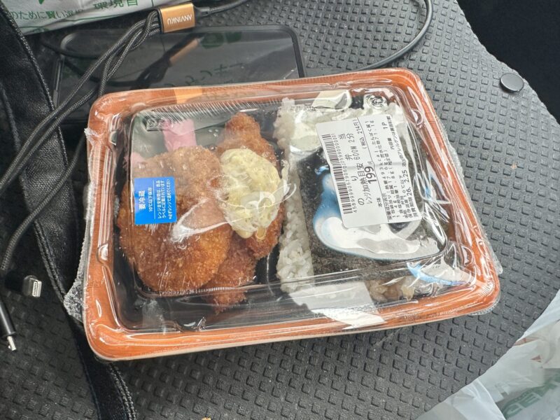朝ごはんと、昼食を兼ねて、またまた”格安ドラッグストアで199円(税込214円)弁当を買って、車中で食べた。揚げ物が油っぽい。絶対、油が参加しているように思う・・・泣