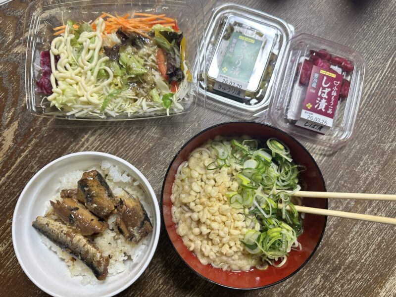 今日は、サラダとそばとイワシ缶詰ご飯。このイワシ缶詰、格安ドラッグストアで、通常の半額の缶詰。缶を開けてみて納得。容量が半分。でも、1回のひとり分としてはこれで十分、タレもあるから。ということで、美味しい”ボッチ飯”を今日もいただきました。最近、炭水化物祭りの晩飯ばかりで太ってきた・・・、これはいけない!!
