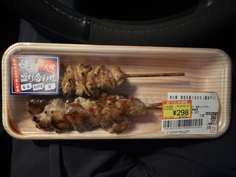 場所は、車中。300円の焼き鳥屋、晩酌。今回は、割引がこの商品しかなかったので”盛り合わせ”だ。
