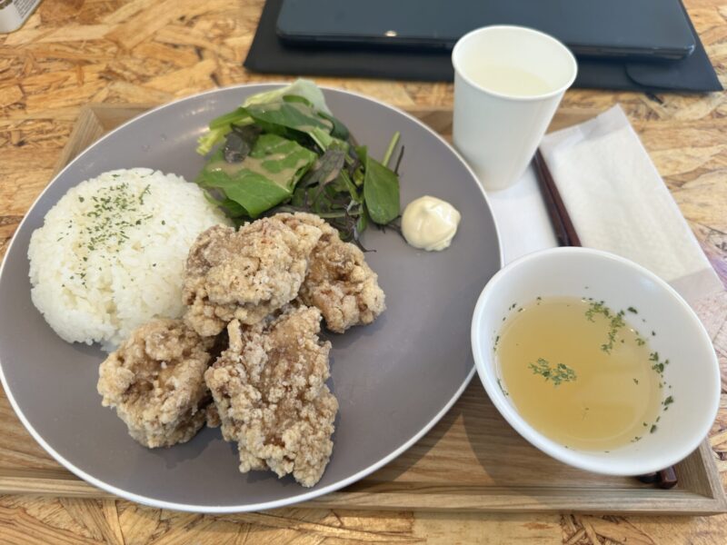 唐揚げ4個とご飯に、少し珍しい葉のサラダとスープ。そしてコーヒー。ん・・・・・・