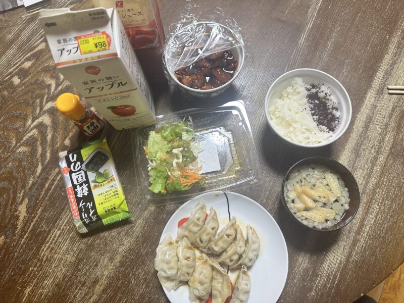 今日は、オーソドックスにご飯とお吸い物と冷凍餃子・・・