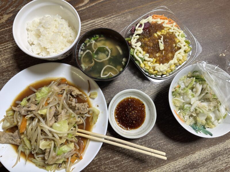 肉野菜炒めを作り、買ってきたサラダで