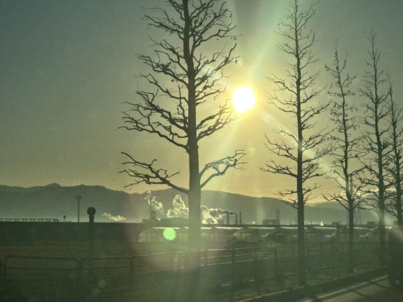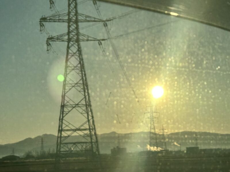 でも外の天気はいい。朝日が眩しい!
