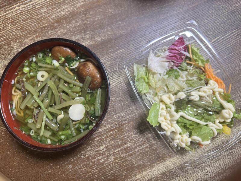 20時になり、ボッチ飯。今日は、マーケットに行ったから、生野菜、サラダと、業務スーパー食材を使った山菜そば。それと、それでは足らず、業務スーパー焼き鳥を5本追加。