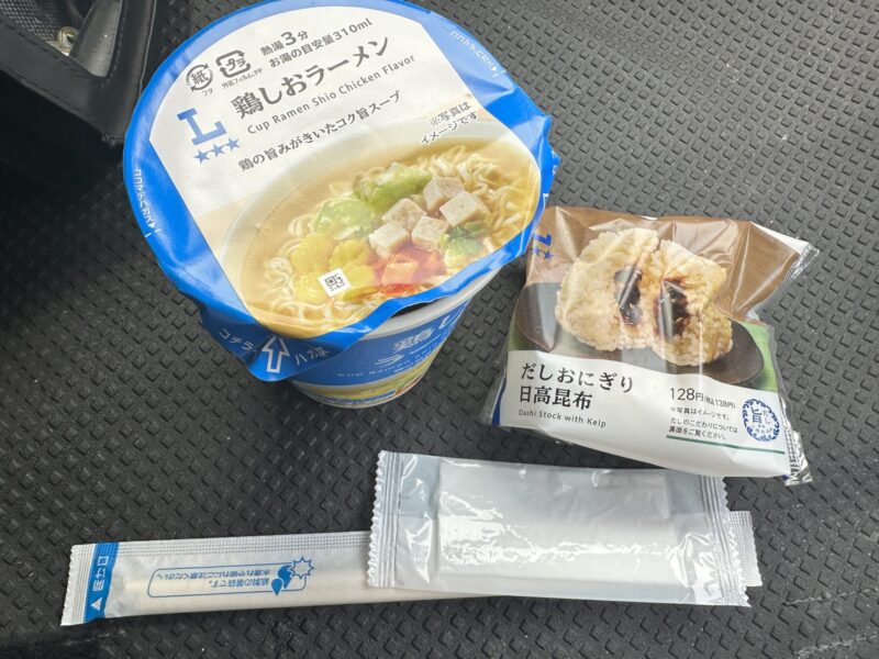 PBカップ麺と一番安いおにぎりをチョイス。普通のおにぎりが200円を超えていて驚いた。物価高だかだなぁ・・・。こんな世界で生活していく息子は大変だろう・・・。私は、コンビニとしてはたぶん、低価格おにぎりの商品にしたのであろう”まわりの海苔を省いた最安値おにぎり”にした。約300円。