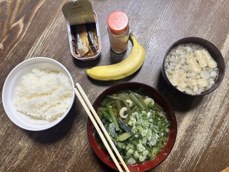 今日もあまり食欲はない・・・、冷凍ほうれん草、冷凍ネギ、山菜たっぷり入れたら、冷えた山菜蕎麦が出来上がった。これだけで、物足りないと思って、ごはんをつけたら・・・やっぱり量が多かった。