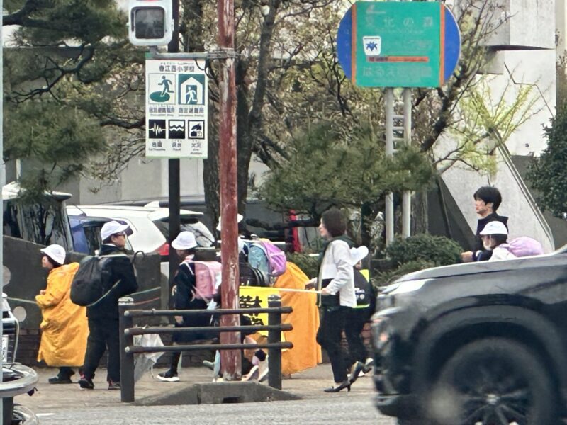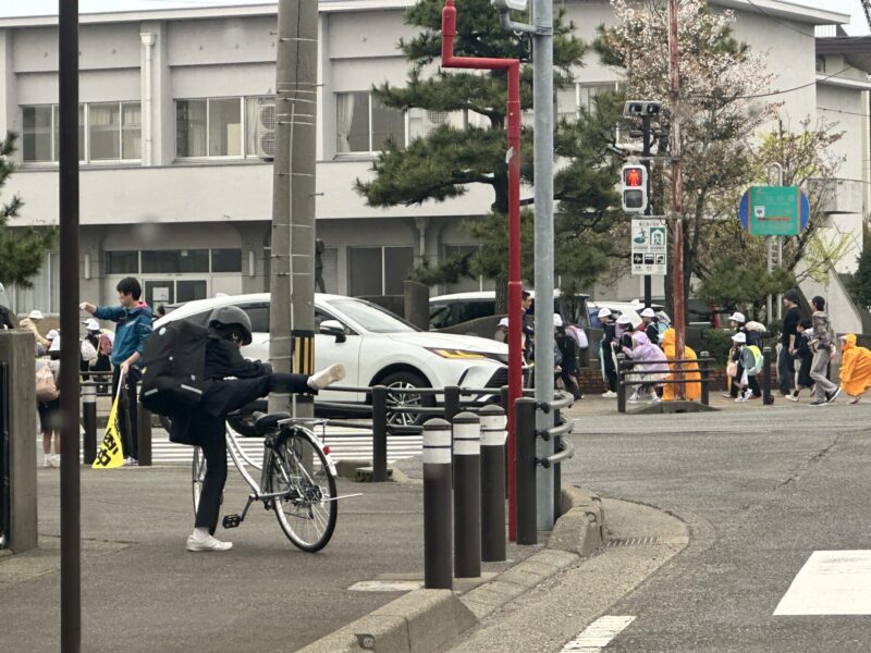 新学期2回目の雨。そんなに強くないが、でもみんなカッパ着るしかないよね・・・、ガンバレ〜!